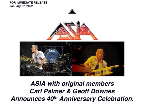 ASIA, one of the greatest and best-loved supergroups to emerge during the 1980s is currently preparing for an extensive 40th Anniversary celebration, due to kick off in summer 2022. Featuring founding members Carl Palmer (ELP, Crazy World of Arthur Brown) and Geoff Downes (Yes, The Buggles) the group will also include long time bassist/ vocalist Billy Sherwood (Yes) and newest member, guitarist/ lead vocalist Marc Bonilla, (Solo artist, Keith Emerson Band). The band is currently being booked for a US tour to start late summer this year.