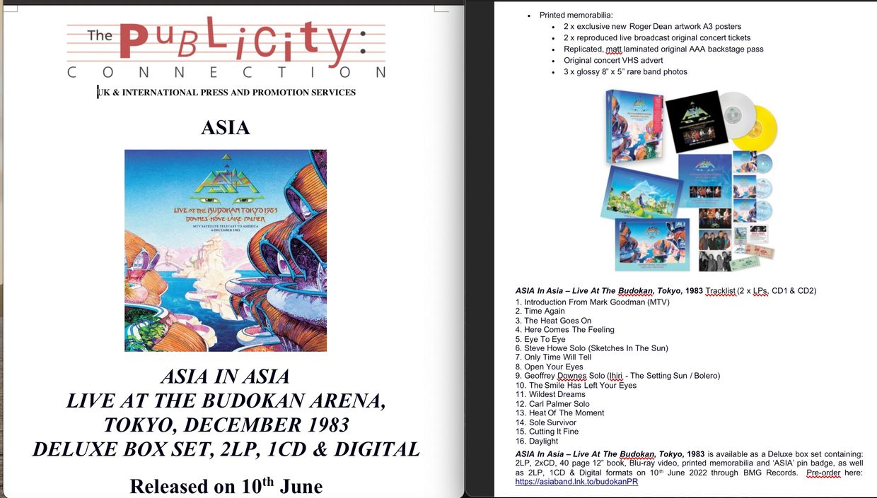 ASIA IN ASIA LIVE AT THE BUDOKAN ARENA, TOKYO, DECEMBER 1983 DELUXE BOX SET, 2LP, 1CD & DIGITAL Released on 10th June 18th March 2022: Multi-platinum selling English supergroup ASIA announce they are to release ASIA In Asia – Live At The Budokan, Tokyo, 1983, as a Deluxe box set containing: 2LP, 2xCD, 40 page 12” book, Blu-ray video, printed memorabilia and ‘ASIA’ pin badge, through BMG Records on 10th June 2022. Also available as a 2LP Gatefold, 1CD and Digital Formats. Pre-order here: https://asiaband.lnk.to/budokanPR